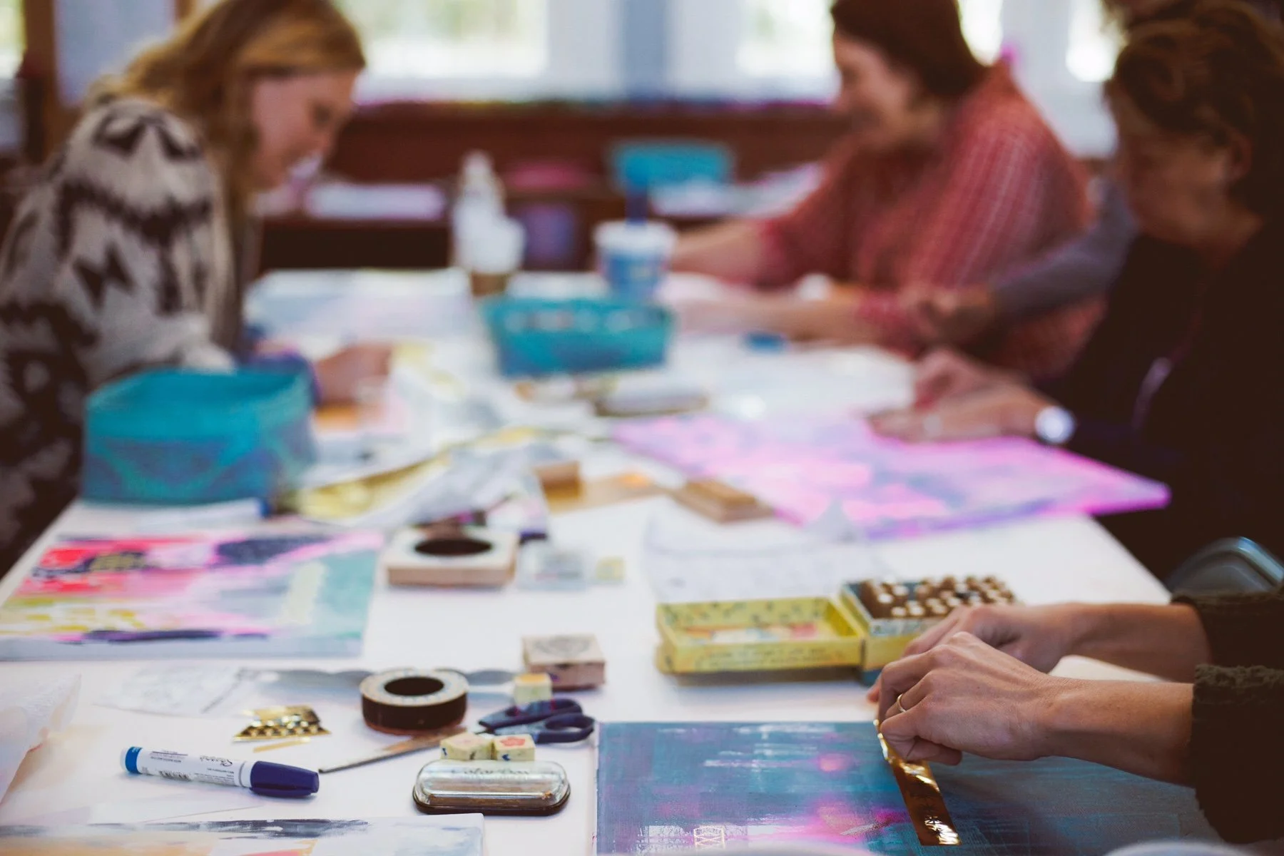 In depth mixed media painting workshops with Mati and Faith: we’ll do a deep dive into our painting favorite painting processes with you in 3 day long painting workshops. You’ll end the week with many finished paintings and so many new techniques to take home with you and continue your painting journey with renewed confindence and depth.